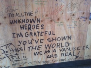 So, because of these three Canuck “rules,” this morning I woke up to, not only the painful reminder that we came so close again, and missed, what we’d been after, not only the horrifying, literally physically disturbing images of the city I love being trashed to pieces by people who probably couldn’t even remember their own names or why they bought the Canucks paraphernalia they just happened to be sporting, but a zillion negative, critical comments from every portion of the media telling me just how awful Canuck fans, Vancouverites, and the players themselves, must be in order for something like this to happen. Not to mention all Canuck forums/facebook pages loaded with fans of opposing teams wishing us nothing but trash and telling us how we’ve never been good enough and never will be.